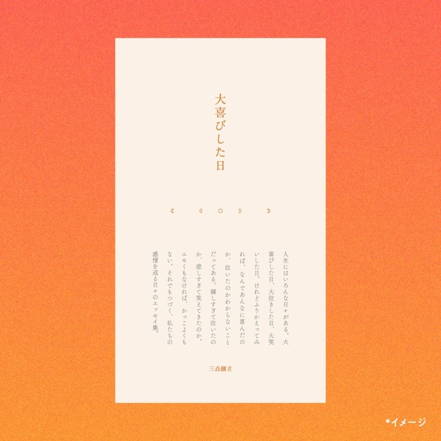 新書判/80p それでもつづく私たちの感情を巡る日々のエッセイ集 人生にはいろんな日々がある。大喜びした日、大泣きした日、大笑いした日。けれどふりかえってみれば、なんであんなに喜んだのか、泣いたのかわからないことだってある。嬉しすぎて泣いたのか、悲しすぎて笑えてきたのか。エモくもなければ、かっこよくもない。それでもつづく、私たちの感情を巡る日々のエッセイ集。 【書き手】 〈エッセイ〉ムカイダー・メイ、佐野裕一、あさのりな、石原空子、後藤花菜、小島あかね、竹田ドッグイヤー、逸見実奈、屋良朝哉、松本慎一、杉山由香、堀江昌史〈短歌〉たろりずむ、謀楽しお、domeki 【概要】 『大喜びした日』は編集とデザインのユニット・三点倒立の制作するリトルプレス。計12名の書き手が「大笑いした日」「大泣きした日」「大喜びした日」の3つのテーマに分かれて、大きく感情が揺さぶられた日のことを書いたエッセイ集です。合わせて3人の歌人が、テーマに沿った短歌を制作しました。 【本文抜粋】 思春期の春菜ちゃんにはそれがつらいこと、そしてそれがわかっていながら母としてどうしたらいいかわからないことを泣きながら話してくれた。何も言えなくて私も泣いた。家の前で立ち尽くしたまま、なにもできずに二人で泣いた。(大笑いした日・石原空子「母の涙」) それらがトドメとなり、これまで堆積したものが一気に崩壊した。帰りの電車に乗り込むと、突然耐えがたい悲しみや怒りが込み上げてきて、まわりに乗客がいるにも関わらず涙が出ては頬をすべり落ちていった。(大泣きした日・小島あかね「パンパンに腫れたまぶたで生きる」) タケノコの香りに小麦の香りが加わり、口の中を満たしてゆく。窓の外を見ると、晴れ渡った空が見えた。遠くの景色は霞でぼやけている。ふと、私がしたかったのはこういう暮らしだったのではないかと思った。採れたての旬の野菜をすぐに調理して食べられるというよろこびは何にも変え難い。(大喜びした日・松本慎一「タケノコを茹でた日」) 【仕様】 新書判(W105mm × H182mm× D5mm)/小口折り製本 80ページ/モノクロ