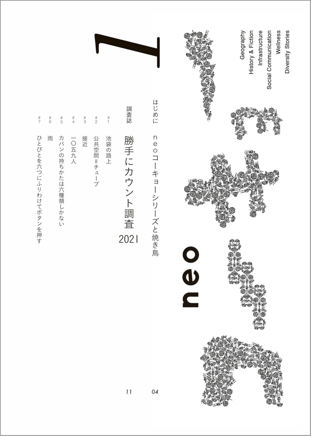歩道のすみっこに座る。前をひとが通る。親指でボタンを押す。カウンターがしめす数字が「000」から「001」になる。また、ひとが通る。親指を動かす――「002」になる。これを14日間続けながら、見えたもの、考えたこと、調べたことを記録した調査誌です。