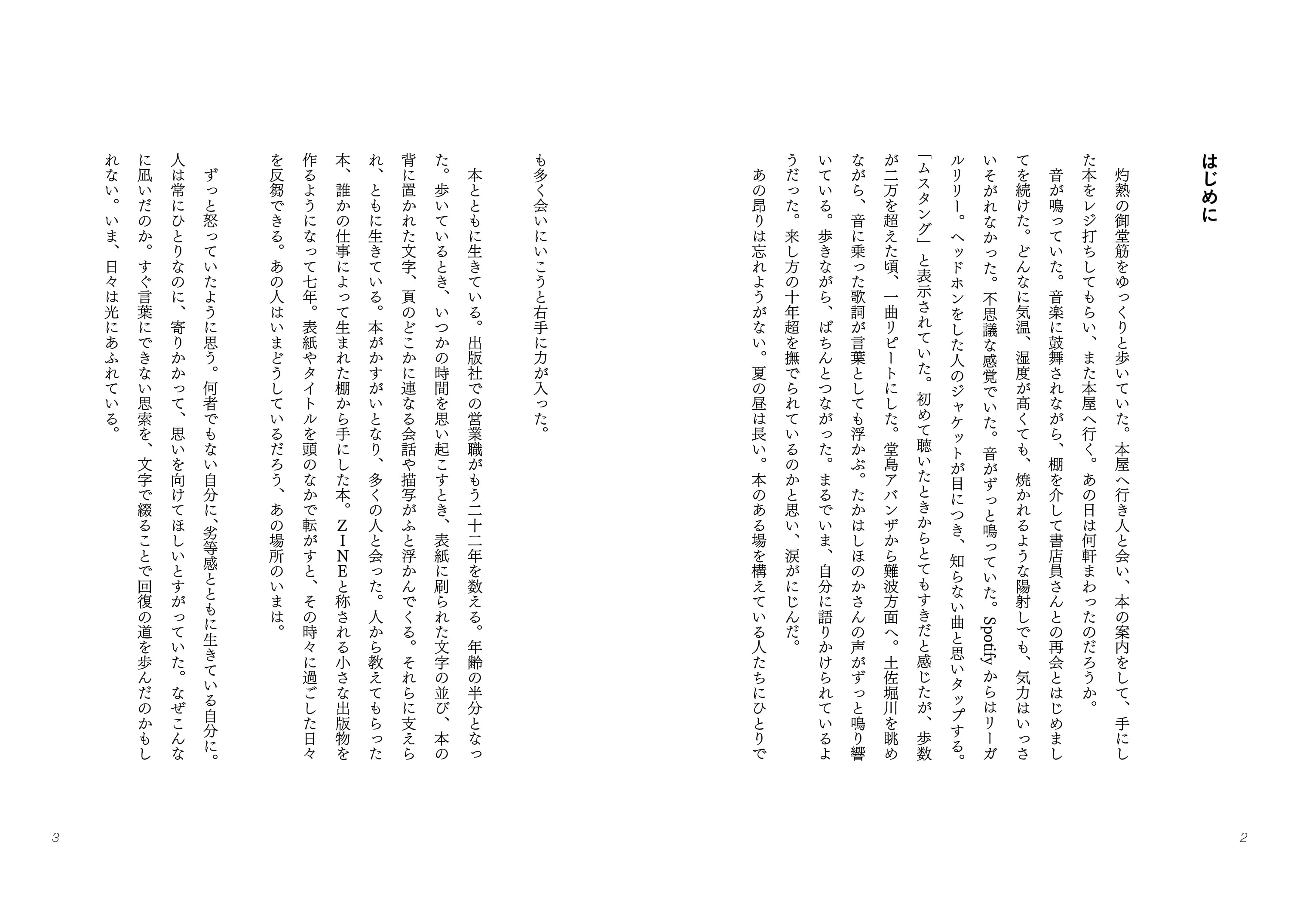 「ずっと怒っていたように思う。何者でもない自分に、劣等感とともに生きている自分に。人は常にひとりなのに、寄りかかって、思いを向けてほしいとすがっていた。なぜこんなに凪いだのか。すぐ言葉にできない思索を、文字で綴ることで回復の道を歩んだのかもしれない。いま、日々は光にあふれている。」(「はじめに」より)